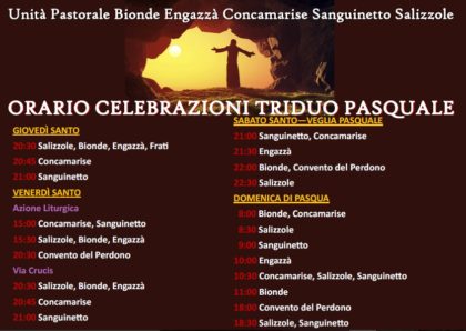 – VEGLIA PASQUALE: ore 21:30 ad Engazzà, ore 22 Bionde, ore 22:30 a Salizzole.